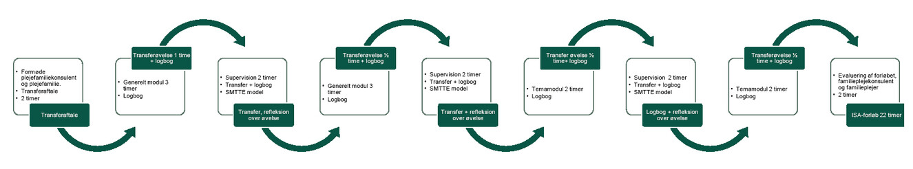 ISA-forløbet består samlet af formøde med familieplejekonsulent og plejefamilie, online undervisning, logbogsskrivning, supervision samt afsluttende evalueringsmøde. Forløbet er bredt ud over en periode, hvor der veksles mellem undervisning og supervision. Plejefamilien får derved større mulighed for at afprøve, udvikle, reflektere over og implementere det lærte.